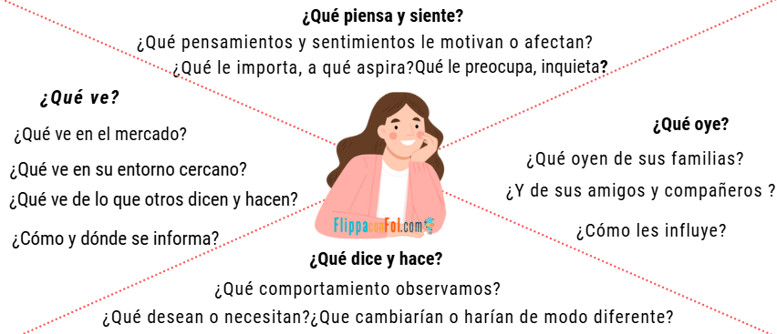 Ponte en la piel del usuario. El mapa de empatía te ayuda a conocerle a través de lo que ve, escucha, piensa, siente y actúa. Sal a la calle y pregunta con pequeñas entrevistas, determinando qué le hace feliz, qué le preocupa y como lo solucionaría.